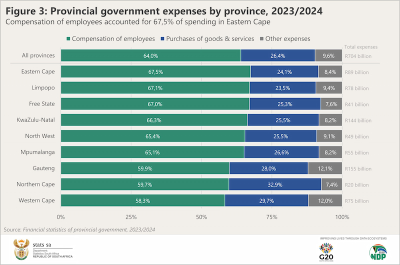 Even KwaZulu-Natal, which reported the highest absolute spend on compensation at R95 189 million, dedicated 63.07% of its total R150 932 million expenditure to salaries.