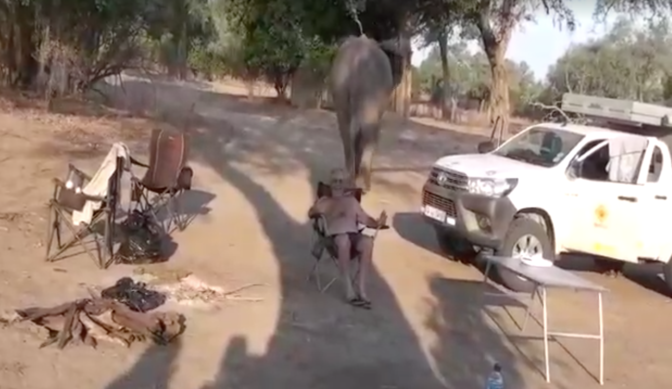 Eish! Watch all the way to the end… as an elephant strolls through a safari camp and gets VERY close up to a tourist, named Trevor, sitting on a chair in his shorts… with his hands up, as if to prove to the elephant he had nothing  to hide!