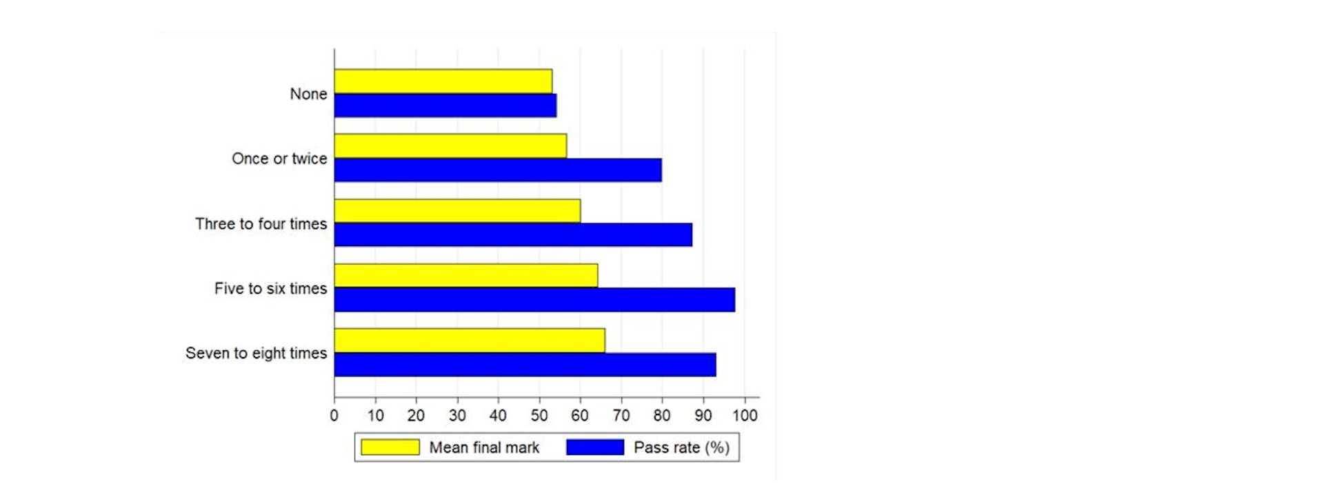 Comparing lecture attendance with academic performance, the graph shows that higher attendance was associated with higher mean final mark and pass rate. In particular, students who attended at least five out of eight lectures, scored a 90% and above pass rate.