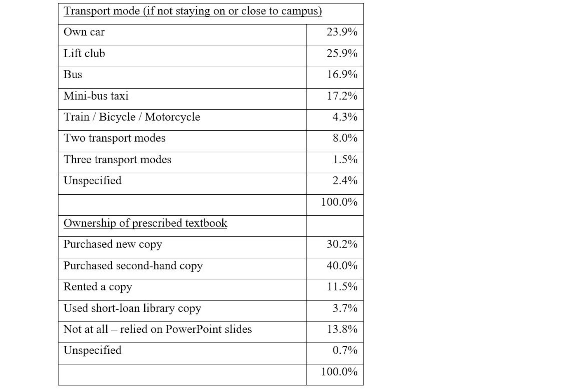 We found that lecture attendance was particularly lower in the afternoon and on Fridays. The main reason students gave for not attending classes was that they were busy studying for tests or completing assignments. Some students relied on PowerPoint slides (instead of using prescribed textbooks) to study, and some spent a lot of time travelling to campus because they used two or even three transport modes to get there. All these factors could have negative implications on students’ academic performances.